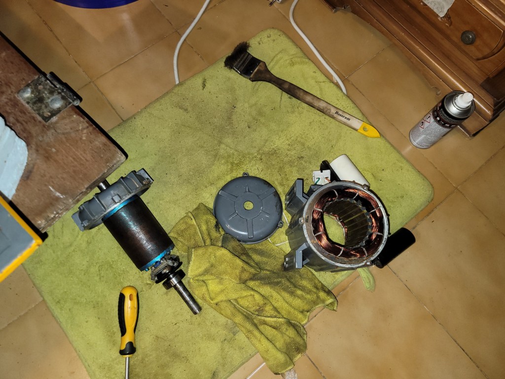 Then I cleaned the motor. I just took it to the bathtub and washed all the dirt out with warm water. Then, WD40 on all wet parts, regrease the bearings and it was ready for reassembly.