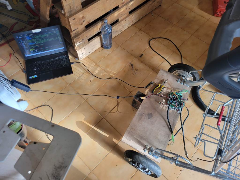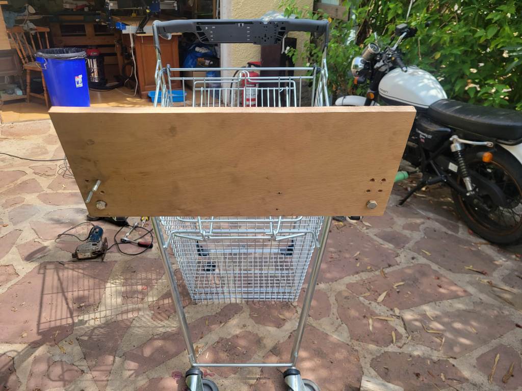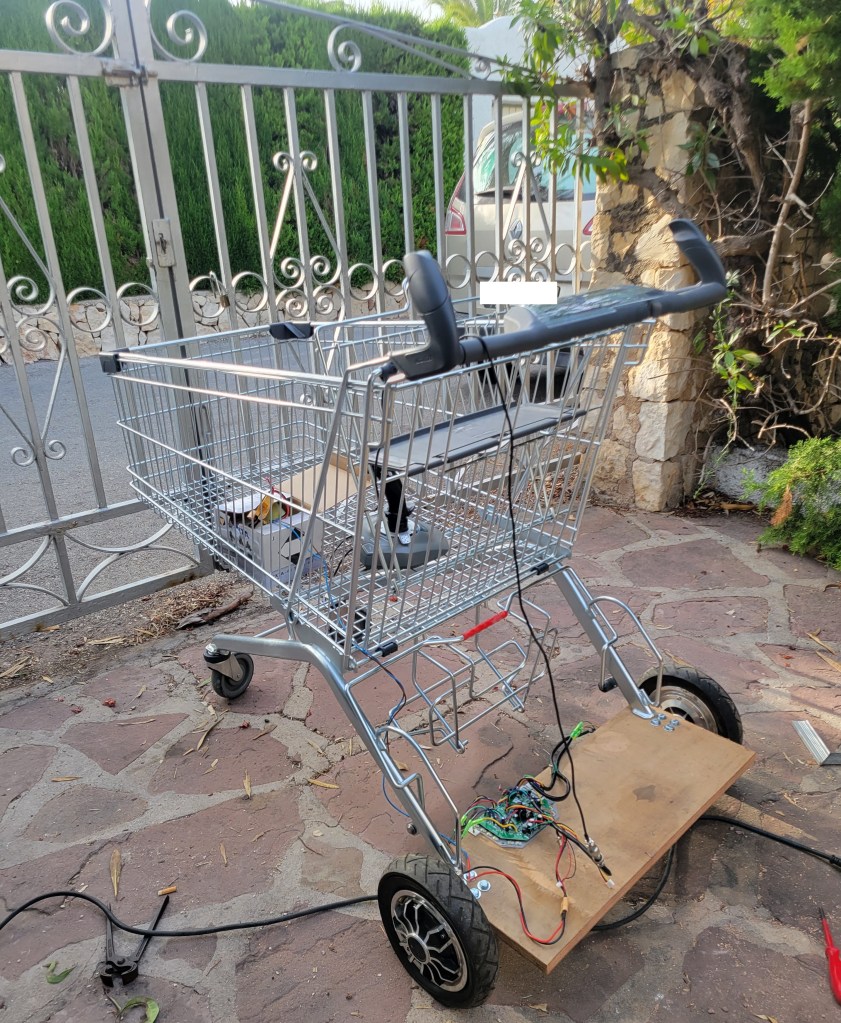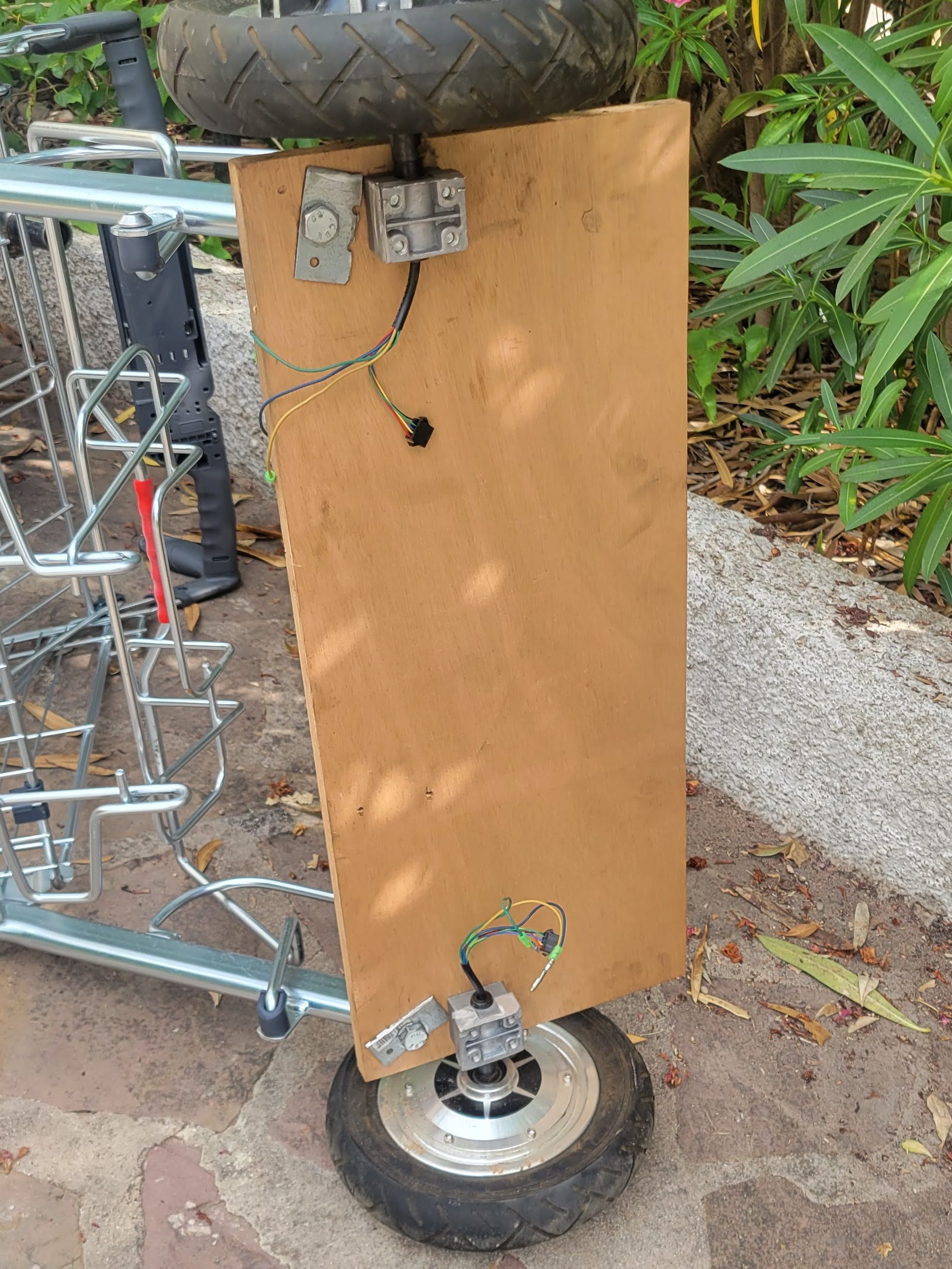 I decided to use 19mm plywood as the connecting element between the motors and the shopping cart. The wheels were placed as close as possible to the cart’s mounting points.